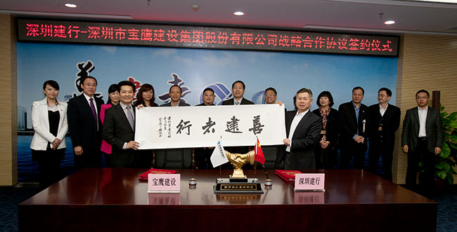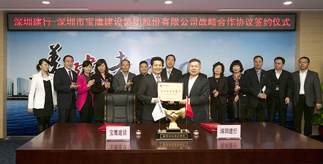 11月28日,中國建設(shè)銀行深圳市分行與深圳市寶鷹建設(shè)集團(tuán)股份有限公司簽定了授信25億元的戰(zhàn)略合作協(xié)議。當(dāng)日下午,在建設(shè)銀行深圳市分行與寶鷹股份相關(guān)出席領(lǐng)導(dǎo)的共同見證下,建設(shè)銀行深圳市分行副行長戴惠明和寶鷹股份董事局主席古少明分別代表建設(shè)銀行深圳市分行和寶鷹股份簽定了戰(zhàn)略合作協(xié)議。