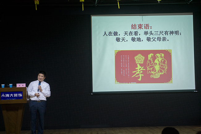 本次,來自包括寶鷹集團在內的7位深圳裝飾行業的專家教授以及200多學員參加了為期兩天的培訓。其中,寶鷹集團副總裁古樸為學員們帶來題為《天人合一》的精彩講座,讓學員們頓時耳目一新,掌聲不斷。講座中,古樸副總裁探討了天人合一的思想在建筑裝飾行業的現實意義。他介紹,建筑裝飾行業其實就是人居環境,其最高境界就是天人合一、道法自然,中國自古講風水,似乎很神秘不可測,而天人合一正是風水精要,風水其實就是古人環境選擇的學問,其核心是生態環境,要求在特定的小環境內部相互協調,以達到生態環境內部的統一。他還指出,天人合一的核心內涵就是以人為本,而以人為本的最高形態正是天人合一,必須同時看到此兩面,才可謂辯證統一。