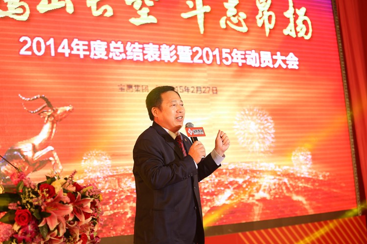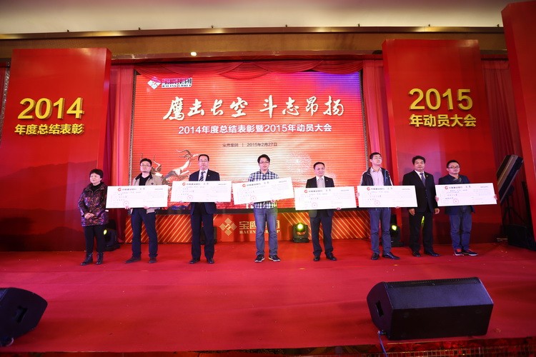大會隨著古少波董事長的精彩致辭正式拉開帷幕。古少波董事長說: 2014 年是我們的事業絢爛多彩的一年,是我們的收獲豐碩喜人的一年,也是我們的信心無比堅定的一年。我們應趁著春風和春陽,用勤勞和智慧譜就樂曲,用寶鷹人的誓言當詞,唱出最美的 2015 年寶鷹之歌。