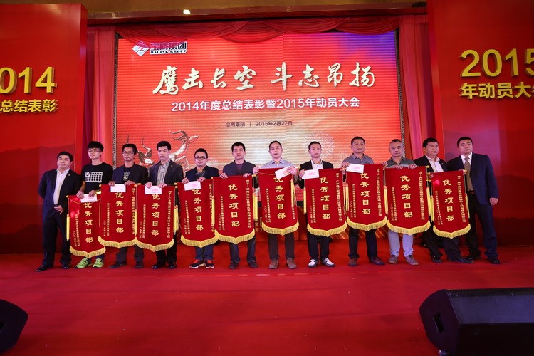 隨后,伴著喜慶的音樂,寶鷹集團監事會主席胡蘭萍宣讀了 2014 年寶鷹集團表彰決定,寶鷹集團諸領導分別為 2014 年度寶鷹集團優秀員工、優秀項目經理、優秀項目部、優秀部門經理、先進集體及最高年終獎獲得者頒獎。在發表獲獎感言時,各位代表皆同觀眾一起分享自己的喜悅、分享自己的工作經驗,表示將一如既往的努力不懈,為寶鷹做出更大貢獻。
