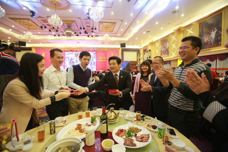 寶鷹集團董事局主席古少明在講話中深情表達了對寶鷹集團同仁在 2014 年努力工作的謝意,并強調 2014 年寶鷹集團的成績是所有寶鷹人團結一致、共同努力的結果。古少明主席亦對寶鷹集團在 2015 年的發展寄予厚望,進一步提出了對 2015 年工作的新要求,動員大家在 2015 年為新的夢想奮斗不止。最后,古少明主席在致辭完畢后和諸位領導、嘉賓一起舉起了酒杯,共同祝福大家新年快樂,羊年大吉!祝酒完畢后,古少明主席神秘地宣布要為現場所有人員派發新春紅包,送上新年祝福。