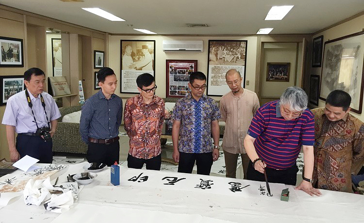 6月22日,周國城主席在古樸副總裁和印尼寶鷹工作人員的見證下,為印尼寶鷹題字,一起祝福印尼寶鷹事業飛黃騰達。6月23日,印尼INTILAND地產集團董事長吳端華設宴接待了周國城主席和古樸副總裁一行,暢敘了與寶鷹的合作情誼。周國城主席在宴席上向吳端華董事長贈送了自己的手卷作品。之后,周國城主席和古樸副總裁在熊德龍董事長和吳端華董事長的陪同下,拜訪了印尼國家安全部部長Stiyoso,并贈送了周國城主席的手卷作品。